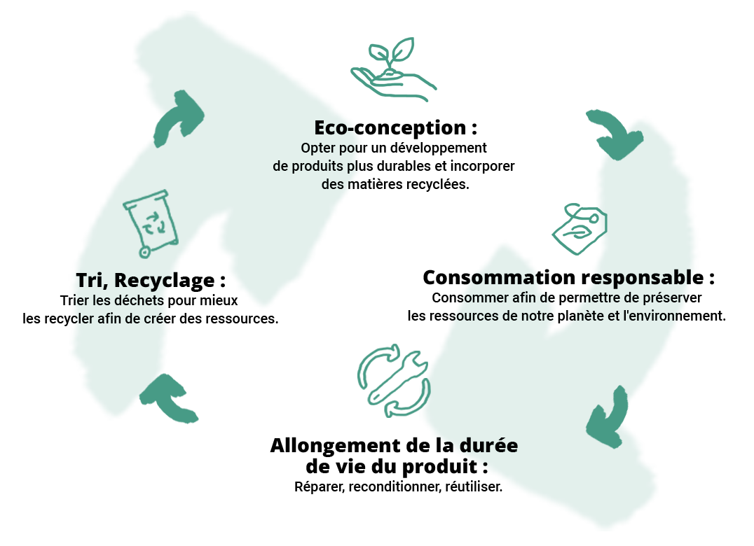 « L’économie circulaire consiste à produire des biens et des services de manière durable en limitant la consommation et le gaspillage des ressources et la production des déchets. Il s’agit de passer d’une société du tout jetable à un modèle économique plus circulaire. »
